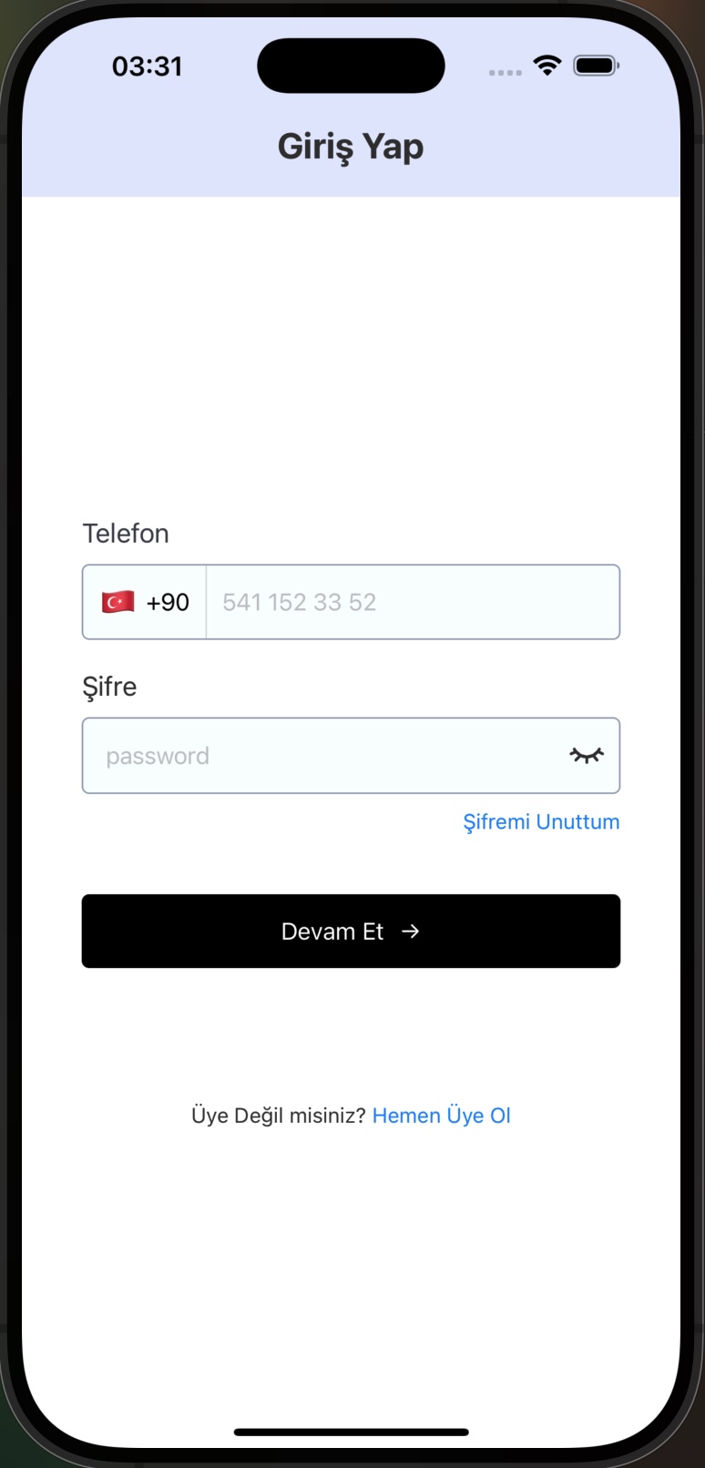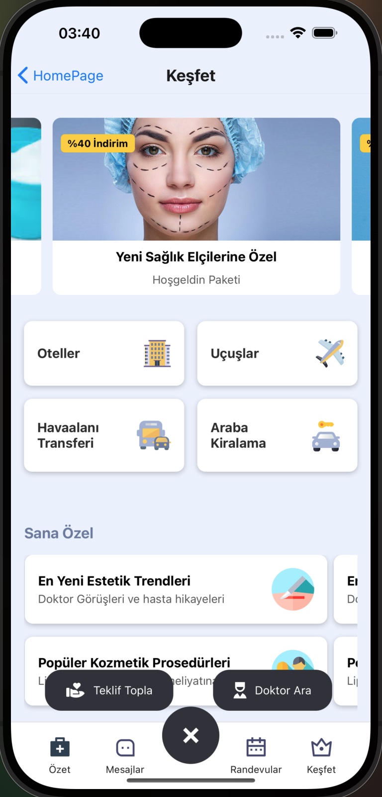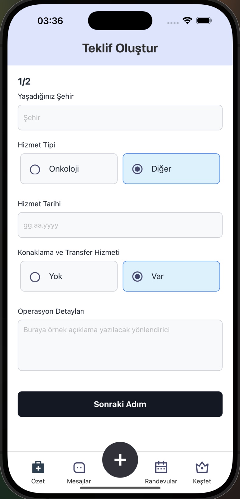 React Native (Expo) ile iOS ve Android için çapraz platform olarak geliştirilmiştir. Tüm veri işlemleri Axios aracılığıyla Spring Boot REST API üzerinden yürütülmektedir. Push bildirimler Expo Notifications ile yönetilmektedir. Redux uygulama state'ini yönetirken, teklif oluşturma ve randevu akışı gibi çok adımlı süreçler React hooks ve Context API ile yönetilmektedir. Agora SDK, elçiler ve sağlık hizmeti sağlayıcıları arasında gerçek zamanlı görüntülü ve sesli iletişimi sağlar.